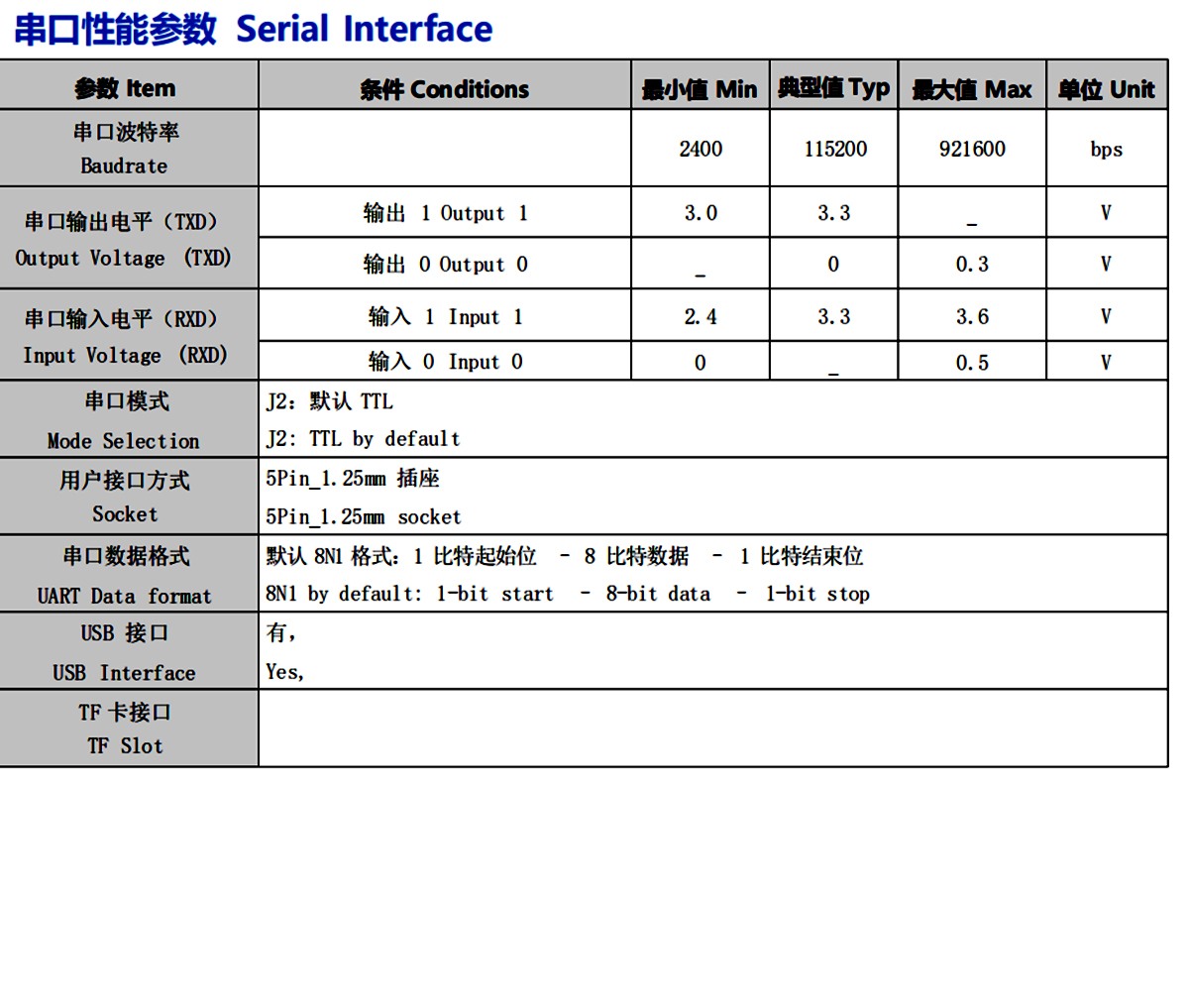 | 串口通讯方式 | Serial Communication Method | TTL | |