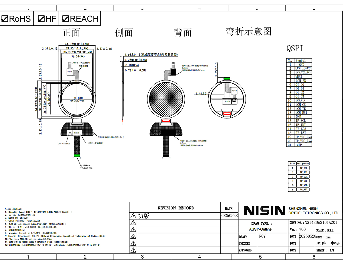 | 1.43寸 466*466 AMOLED 触摸串口屏 | 尺寸 | Dimensions | 1.43寸 |
